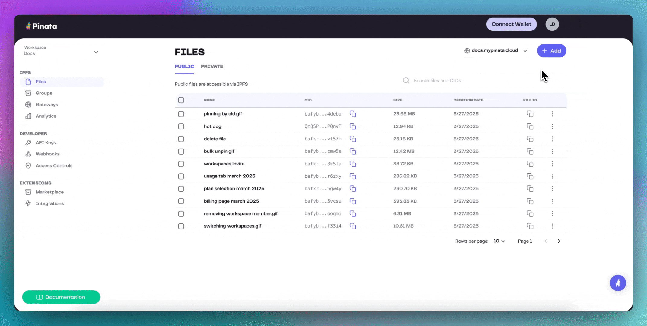 The first thing you need to do is upload the content to Pinata. Since IPFS supports any kind of file, the truth is any kind of file can be an NFT. How that file is referenced in the metadata is a bit of a different story, so be sure to check metadata standards to make sure you content will be seen on marketplaces or wallets. To upload the content you can either do a simple upload through the Pinata App by navigating to the files page and uploading through the UI like so:Step 2: Create and Upload Metadata
