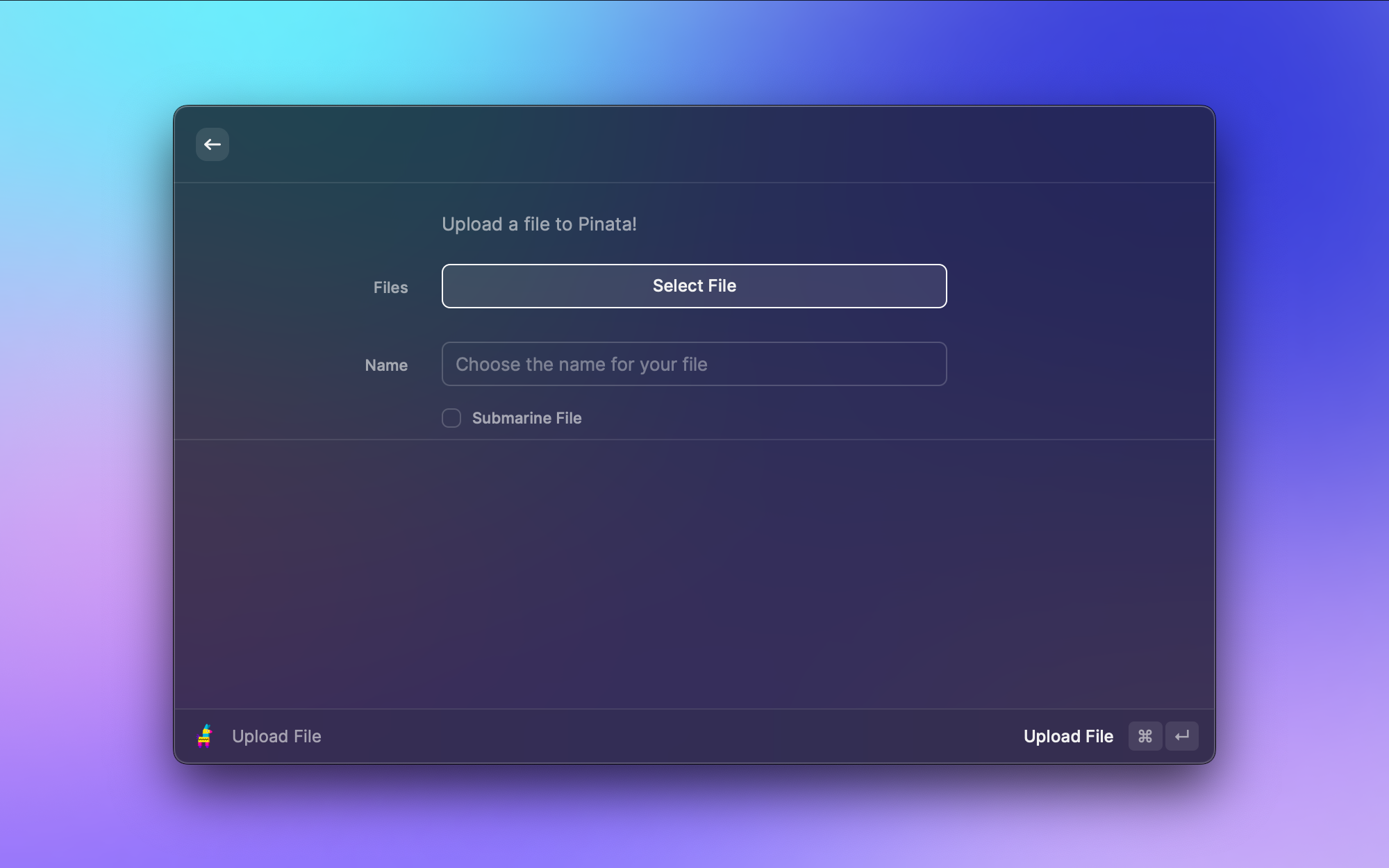 To upload a file simply open Raycast and start tying “upload file” and you should see the Pinata command to upload. You can either upload a file or a folder! After selecting you can select the file and give it a name, then use Command + Enter to upload it.