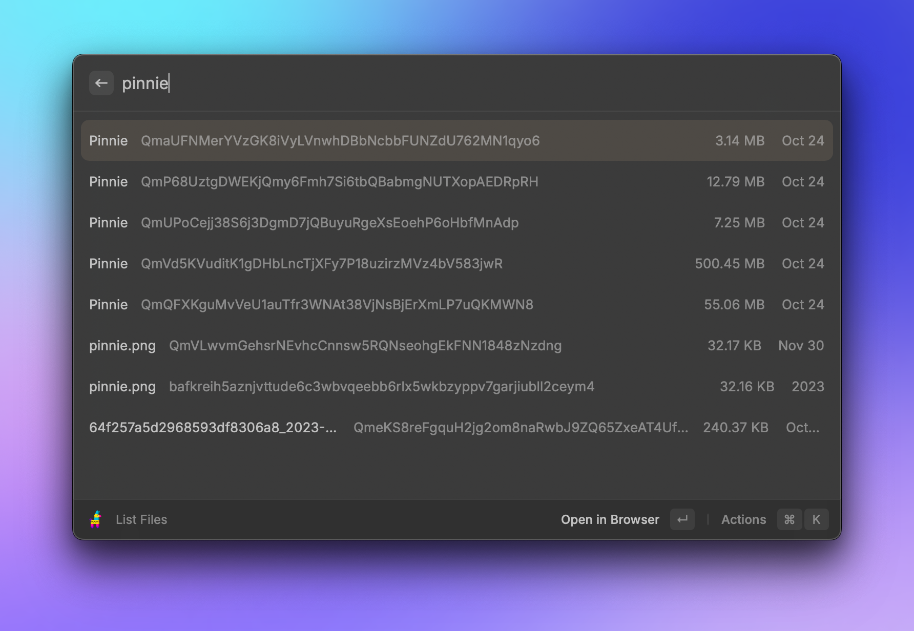 You can also list your most recent files by opening Raycast and typing “list files.” This will return your most recent files where you can search for a CID or file name in particular, as well as: