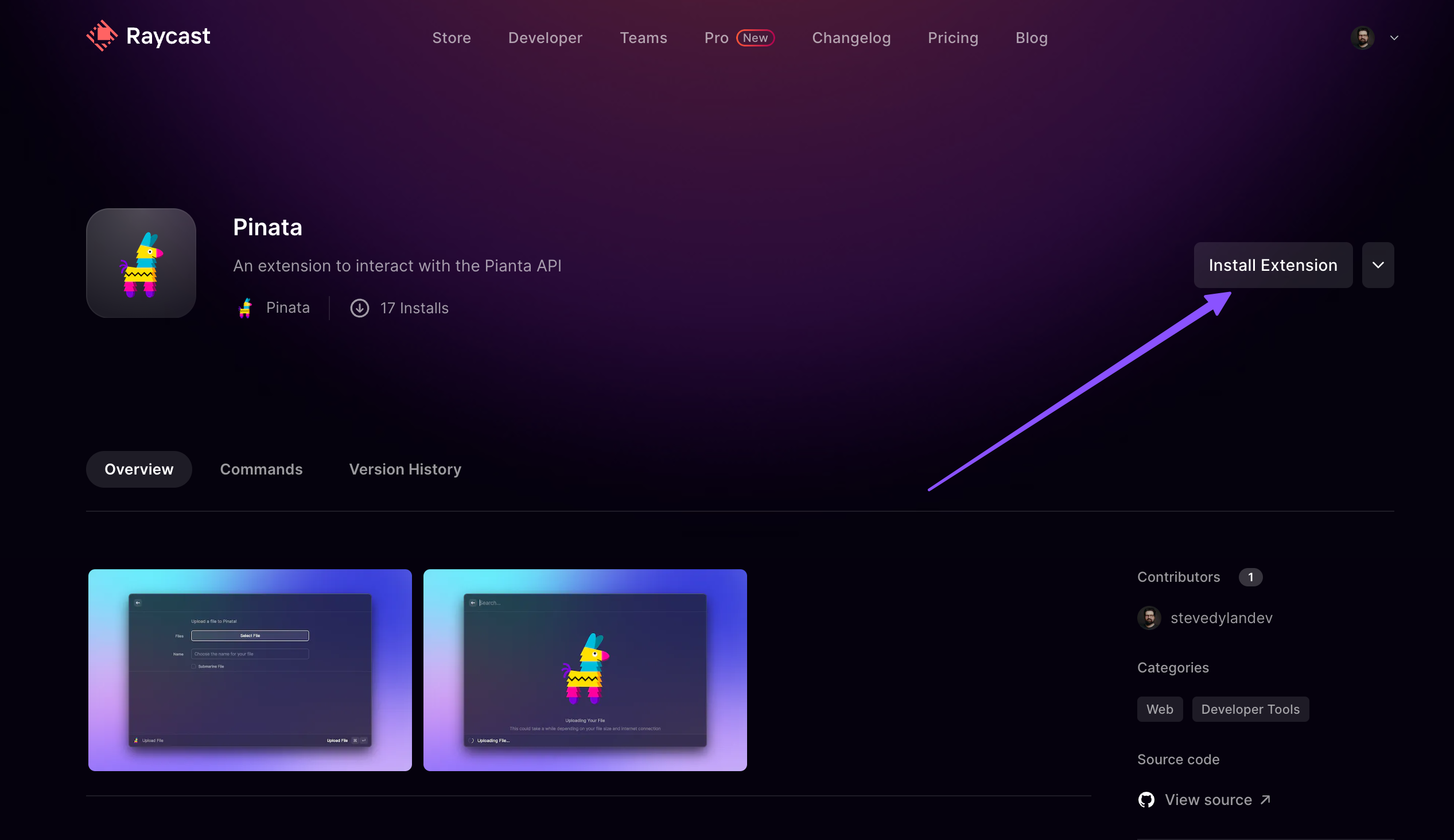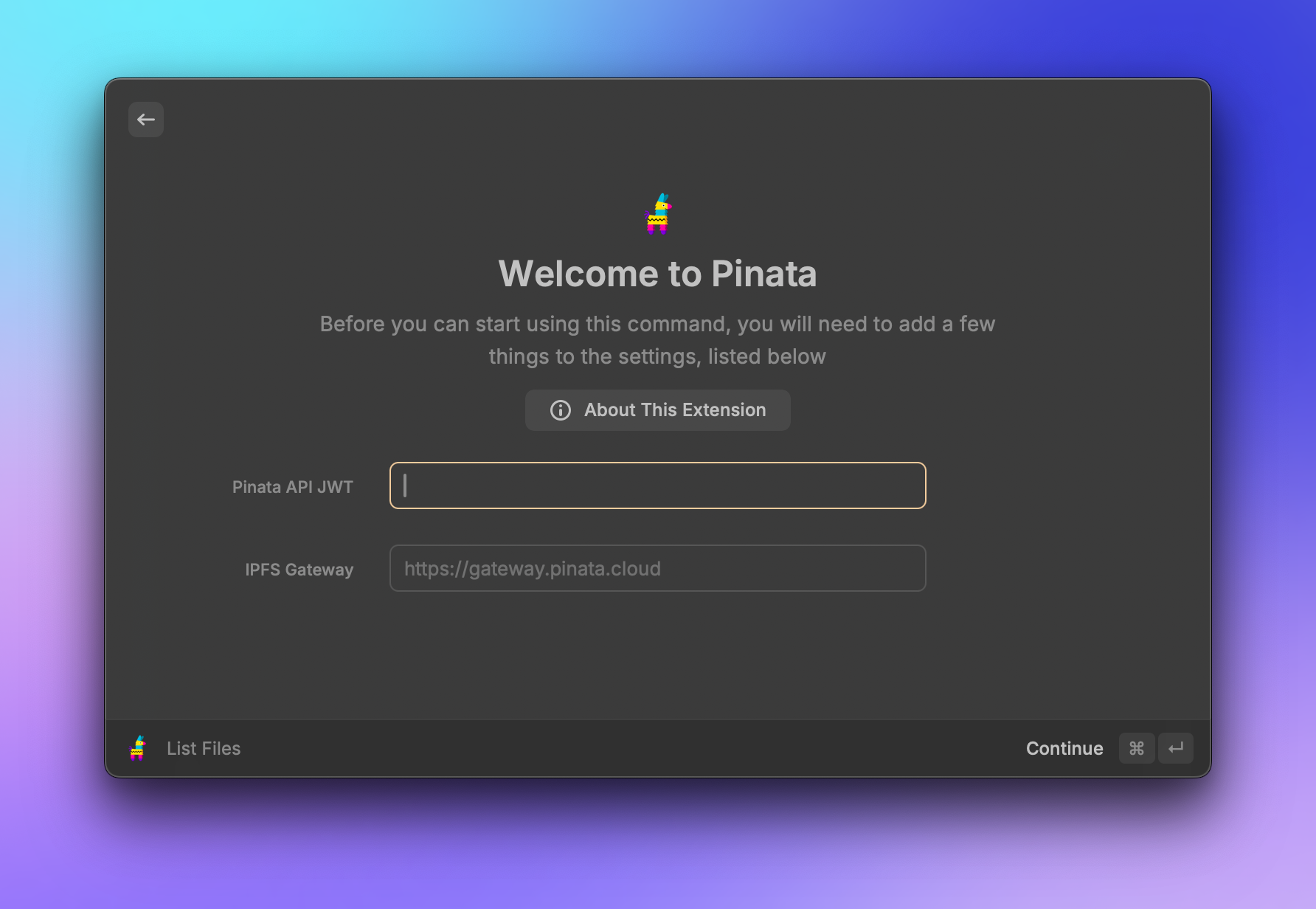 In order to use this extension you will need a Pinata API Key JWT and a Dedicated Gateway, which are both included on the free plan! Here is a guide on making your API key, and here is where you can find your Dedicated Gateway domain.You will also need to install Raycast to your computer which you can do by visit Raycast.Next visit the Pinata Extension store page and click “Install Extension” in the top right.Once installed you can try running it, and it should prompt you to add some details before using the extension. Paste in your Pinata API Key JWT from earlier, as well as the domain for your Dedicated Gateway. It should be in the format of https://mygateway.mypinata.cloud.